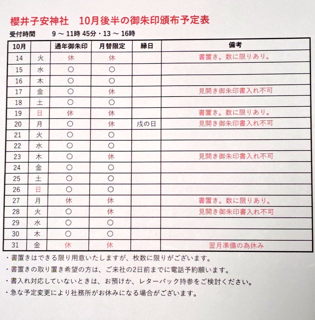 櫻井子安神社、左右神社(本務社)のお知らせとなります。
